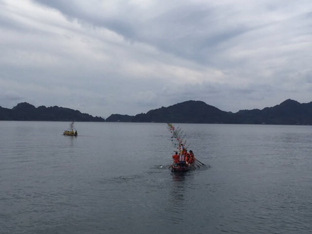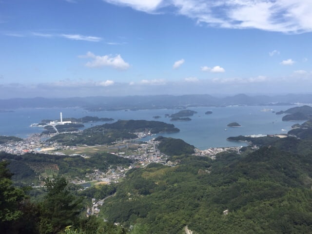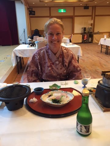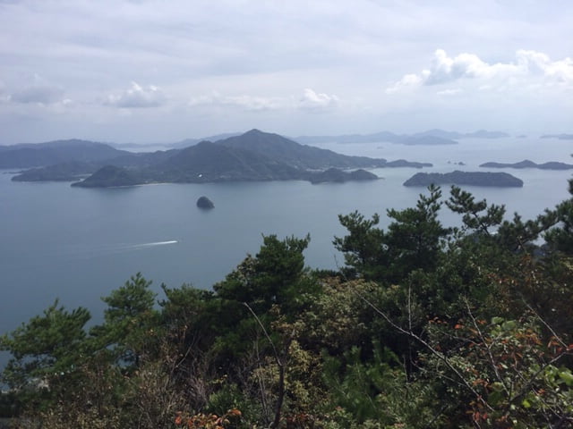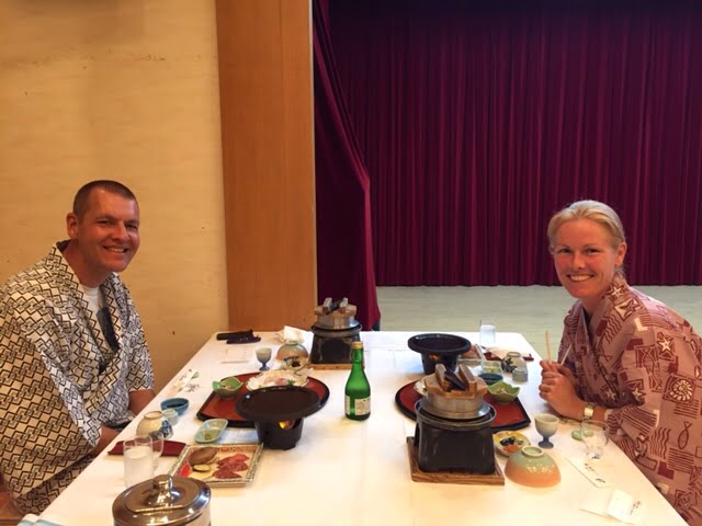 09-10-2016: Nu weten we waarom elke Japnner houdt van de onsen. De matrassen en kussens van de Japans ingerichte kamers zijn zo hard, dan je je in de ochtend eerst een half uur in het warme bad moet liggen om je spieren en gewrichten weer los te maken. In het hotel zijn we de enige westerlingen, dus vandaag moesten we toch echt geloven aan een Japans ontbijt: misosoep, rijst en allerlei soorten groenten en vis. Er dreef iets onbekends en slijmerig in de misosoep dat toch niet helemaal mijn ding was. Wouter had ook nog een ei gevonden, helaas het was niet gekookt. Gelukkig was hij subtiel begonnen om de schelp eraf te halen. Er was ook nog een schaal met fruit en yoghurt en een sausje van zwarte bessen, waar deze regio om bekend staat. Later zagen we nog een schaal met broodjes, croissants en suikerwafels staan. Helaas niet zo lekkere broodjes als in de grote stad, maar we konden er weer tegenaan. We dachten dat het toch weer handig zou zijn om onze rugzakken te versturen naar ons volgend hotel, aangezien we morgen Hiroshima willen bezoeken en we daarna doorreizen naar Miyajimii, dus een stuk met de auto, tram, een boot en lopen naar het hotel. Het was duidelijk dat ze dit hier nog niet vaak hadden gedaan. Gelukkig werd onze vriendelijke dame, die een beetje Engels spreekt, er weer bij gehaald en hadden we er alle vertrouwen in dat het goed zou komen. Toen we een half uur later vertrokken op ons tourtje rond het eiland, werden de rugzakken al ingeladen in het busje van de post. We hadden een kaart meegekregen met alle bezienswaardigheden van het eiland, dat 43 vierkante km is. De eerste stop zou de Konnomine berg (452,6 meter hoog) zijn. In het volgende dorp bleek er een matsuri (festival die wordt gehouden ter ere van de oogst) aan de gang te zijn. We zagen op zee vier roeiboten liggen met per versierde boot een man of 20 met ofwel rode, gele, blauwe en oranje kleding aan. Je hoorde tromgeroffel en geschreeuw om ervoor te zorgen dat ze synchroon roeiden. Aan de kant van de weg stonden een aantal mensen te kijken, dus de auto gauw geparkeerd. Toen we vroegen wat er aan de hand was, vertelden ze in gebroken Engels, aangevuld met hulp van de vertaalmachine op de telefoon dat het een festival was van de shrine en dat er verderop zou gedanst worden. Ze wenkten ons dat we mee moesten meelopen. Er waren een aantal kinderen bij die ons wel erg interessant vonden en maar in Japans  bleven kletsen, ondanks dat we er niets van verstonden. We zagen dat er naast de vier roeiboten ook een gemotoriseerde boot was, met allemaal mannen in pak en twee jonge meisjes en een oudere man in klederdracht. Het duurde even vooraleer iedereen uit de boot was, want de loopplank die ze meehadden bleek erg kort te zijn. Eerst prevelde de oudere man een aantal verzen en sloeg hij een aantal maal op een trommel. Later dansten de meisjes met een waaier en later nog met belletjes. Je kan het een beetje vergelijken met kermis bij ons in het dorp en dat de pastoor dan een kerkdienst houdt. We kregen nog een drankje aangeboden, maar dat zag er erg vies uit en was ook niet te drinken, een soort geklonterde mierzoete melk. Het is wel erg jammer dat je niet even kan kletsen met de lokale bevolking, want het leek erop dat het hele dorpje was uitgelopen, inclusief de twee oudste bewoners in rolstoel.  Iedereen ging terug in de boot en ze roeiden de zee op. Het was erg leuk om dit mee te maken. Daarna zijn we naar de berg gereden, de jongen in het hotel had al gezegd dat het een erg smal weggetje was en daar was niets aan gelogen. Gelukkig geen tegenliggers. Bovenaan had je een prachtig uitzicht op één kant van het eiland, waar vooral ook veel industrie was. We zijn nog een klein stukje naar een ander uitkijkpunt gelopen van waar je ons hotel kon zien liggen. Je kon nog naar twee andere uitkijkpunten klimmen, maar dat hebben we niet gedaan, want we hebben geen water en eten bij ons en het was alweer bijna lunchtijd. We merkten al snel op dat het erg uitgestorven is en er nauwelijks winkels open zijn, waarschijnlijk omdat het zondag is. Wouter heeft ons keurig genavigeerd naar een dorpje en gelukkig was de supermarkt open en konden we een bentobox sushi scoren. We zijn naar het Ogushi strand gereden en hebben daar heerlijk gelunchd. Het is vandaag heerlijk weer een graad of 25 en nauwelijks bewolking. We hebben via de rondweg het hele eiland rondgereden. Er is erg veel industrie, met name havens, scheepswerven en hier en daar een grote fabriek. Het is duidelijk dat ze niet gericht zijn op toerisme. De informatie van het reisbureau dat de tijd hier is blijven stil, delen we niet, maar het klopt wel dat het niet toeristisch is en het gewone leven van een Japanner weerspiegeld. We waren rond een uur of drie weer terug bij het hotel. Wouter heeft het sportkanaal van ziggo weer aangezwengeld om naar Max Verstappen en Formule 1 te kijken en ik ben naar het strand gelopen, wat bij het hotel zit. Aangezien de Japanners niet houden van een bruine tint lig ik hier helemaal alleen. In Kyoto viel het al op dat als het een dag zonnig was, iedereen onder een paraplu liep of handschoenen of een zonneklep (maatje lasbril) op had. Ik heb nog even een duik genomen in Japanse binnenzee. Zoals gewoonlijk zijn we de onsen ingegaan en op even genoten van het prachtige uitzicht en de ondergaande zon. Vanavond hebben we opnieuw een uitgebreid menu gekregen, oa. biefstuk op de grillplaat en opnieuw veel vis. Als je in Japan bent moet je een keer sake (rijstwijn) drinken. Het had een alcoholpercentage van 16%, gelukkig kregen we maar één flesje. We kregen advies van de leuke serveerster, maar of het nu echt een aanrader is. Ik ben er nog niet van overtuigd.